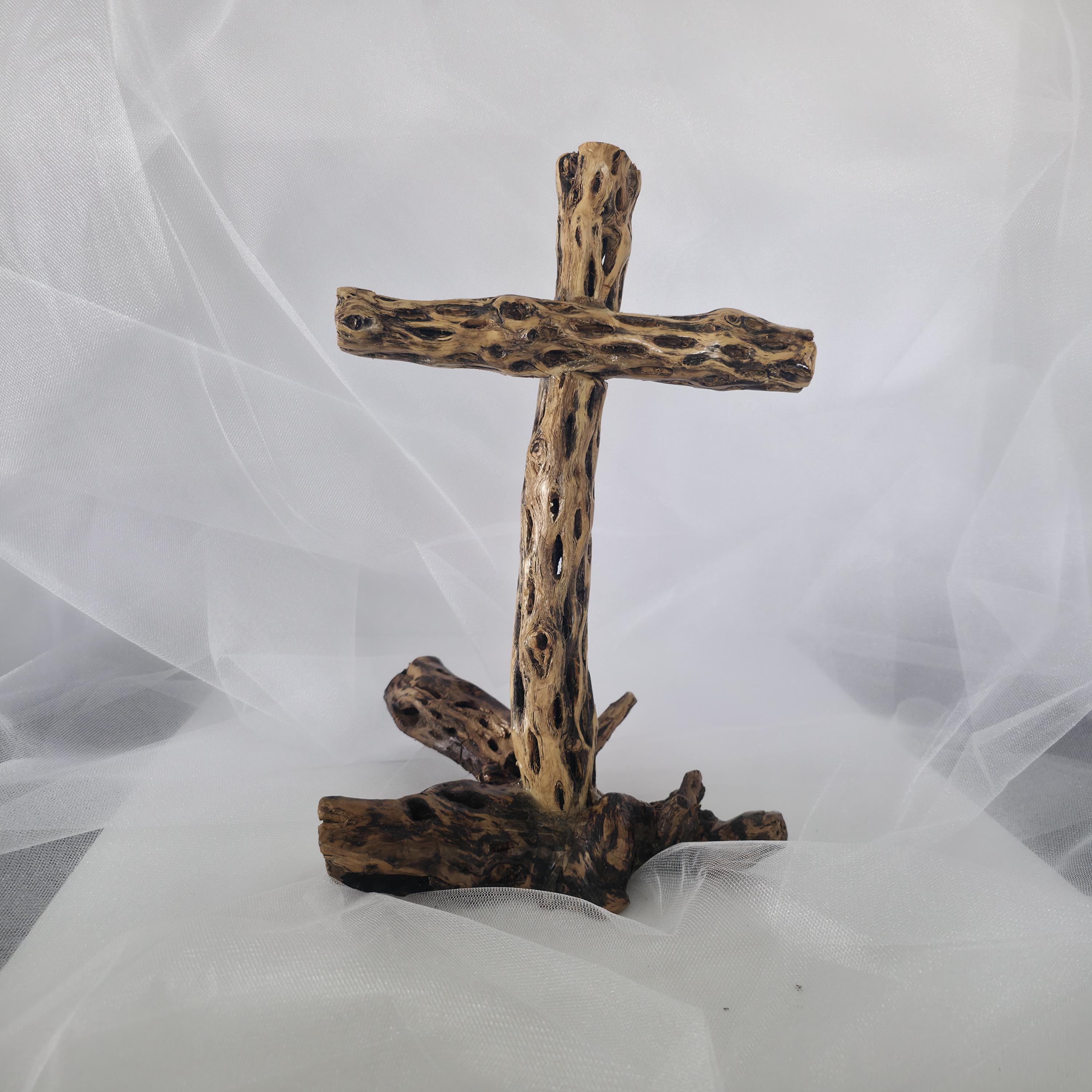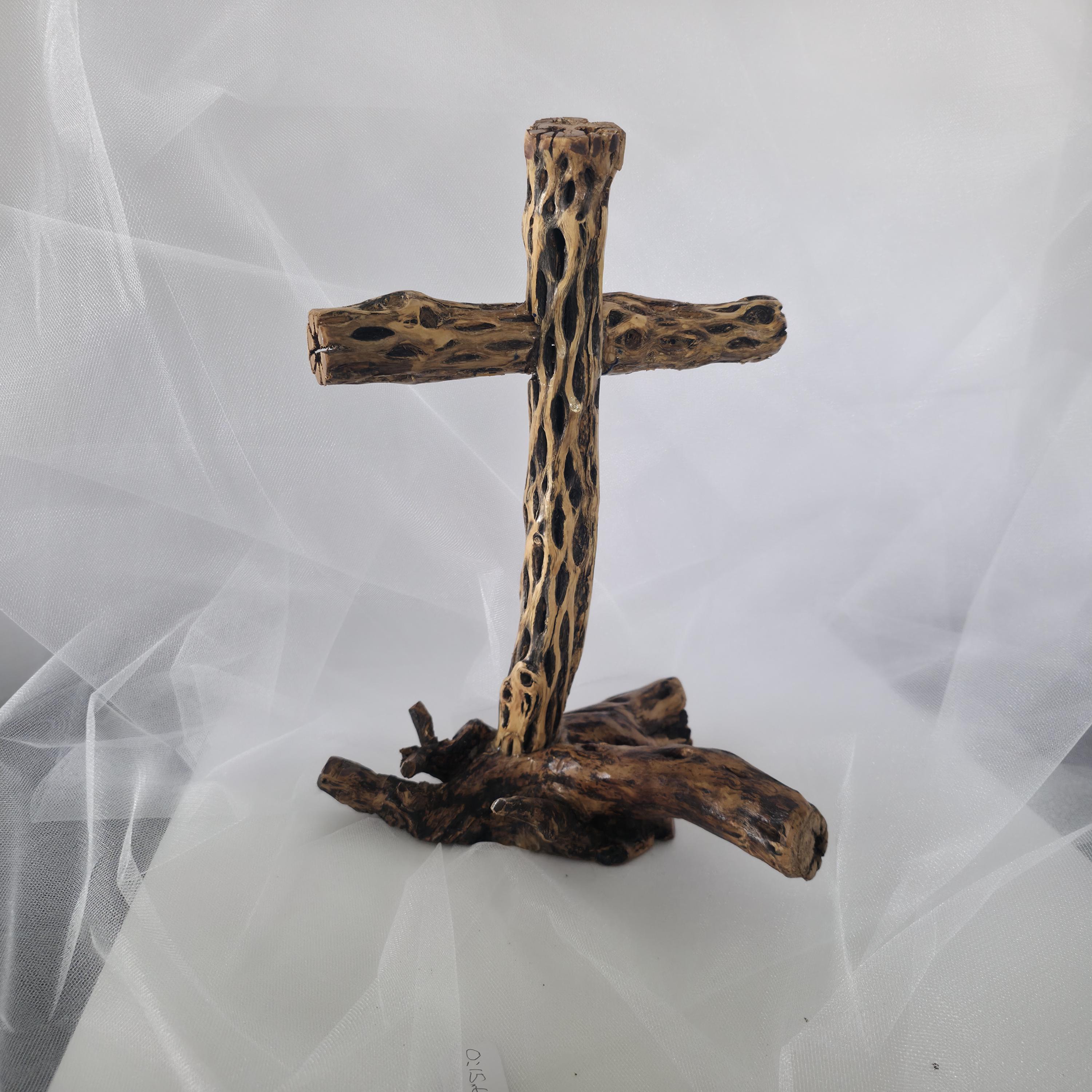 Embrace the rugged beauty of the desert with this one-of-a-kind handmade Cholla Cactus Wood Cross. Each piece is carefully crafted using authentic dried cholla skeleton, known for its iconic organic "lattice" or "honeycomb" patterns. This cross is securely mounted on a sturdy, natural wood base, creating a striking silhouette that balances rustic charm with spiritual significance. Because cholla is a natural material shaped by the elements, no two crosses are exactly alike. You are receiving a unique work of art that brings the spirit of the American Southwest into your home. Product Features: • Materials: Authentic Cholla Cactus Wood, Natural Driftwood/Root Base. • Style: Rustic, Southwestern, Boho, Farmhouse. • Dimensions: 8x6x12• Usage: Perfect for a mantle, bedside table, or as a meaningful housewarming or baptism gift. • Handmade Quality: Sanded and finished to highlight the natural wood grain and textures. Note: As this is made from natural desert wood, slight variations in color, texture, and shape are to be expected and celebrated!