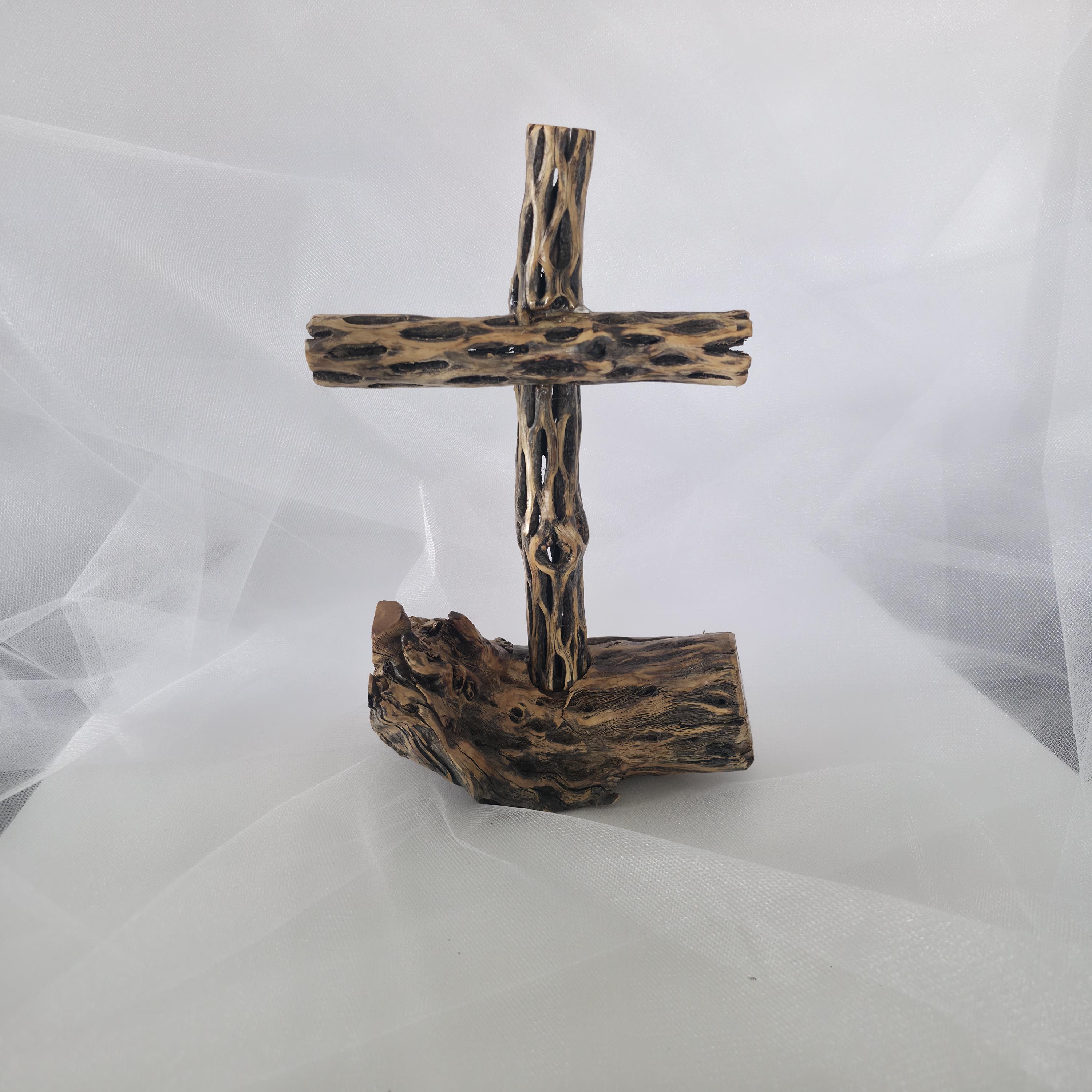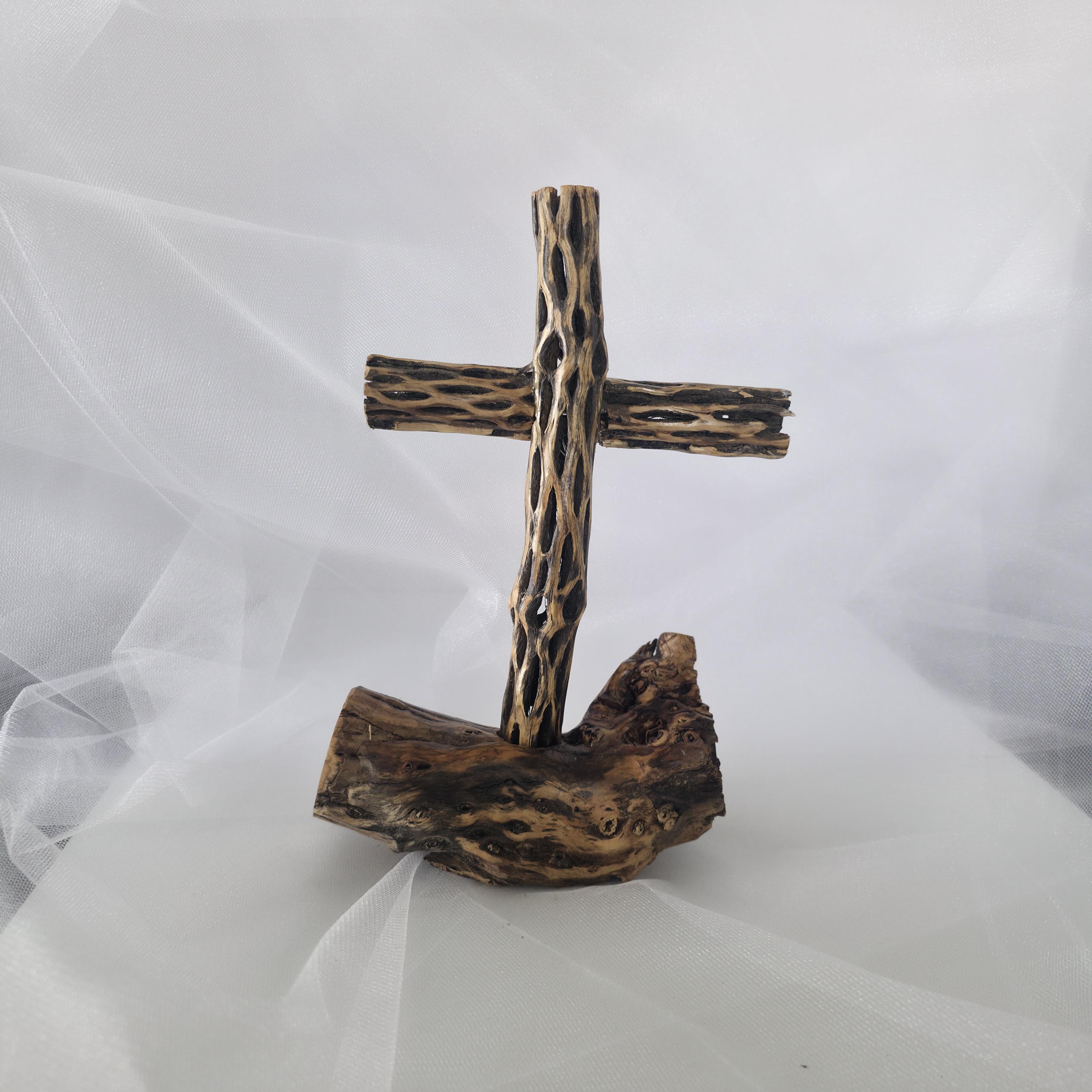 Embrace the rugged beauty of the desert with this one-of-a-kind handmade Cholla Cactus Wood Cross. Each piece is carefully crafted using authentic dried cholla skeleton, known for its iconic organic "lattice" or "honeycomb" patterns. This cross is securely mounted on a sturdy, natural wood base, creating a striking silhouette that balances rustic charm with spiritual significance. Because cholla is a natural material shaped by the elements, no two crosses are exactly alike. You are receiving a unique work of art that brings the spirit of the American Southwest into your home. Product Features: • Materials: Authentic Cholla Cactus Wood, Natural Driftwood/Root Base. • Style: Rustic, Southwestern, Boho, Farmhouse. • Dimensions:5x5x11 • Usage: Perfect for a mantle, bedside table, or as a meaningful housewarming or baptism gift. • Handmade Quality: Sanded and finished to highlight the natural wood grain and textures. Note: As this is made from natural desert wood, slight variations in color, texture, and shape are to be expected and celebrated!