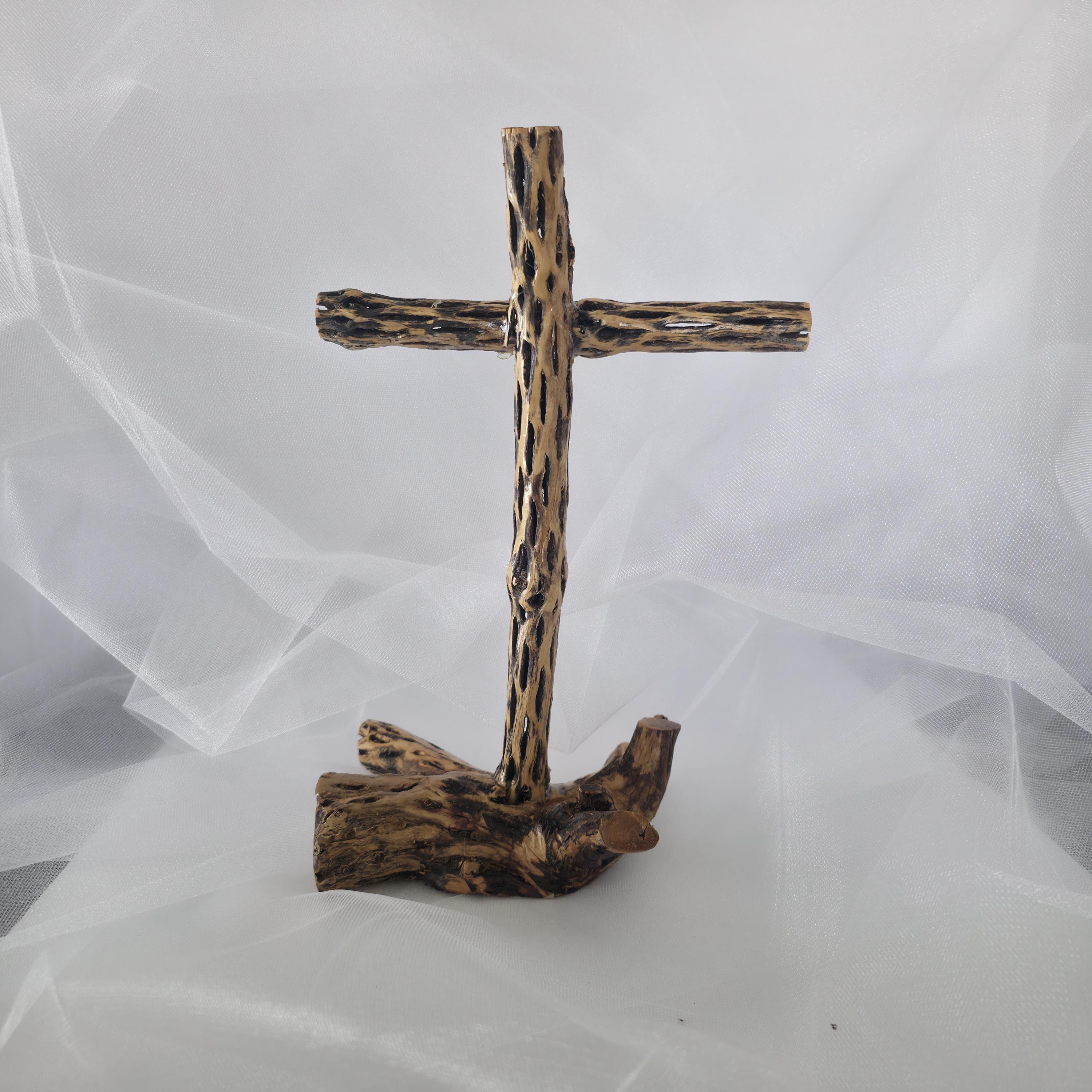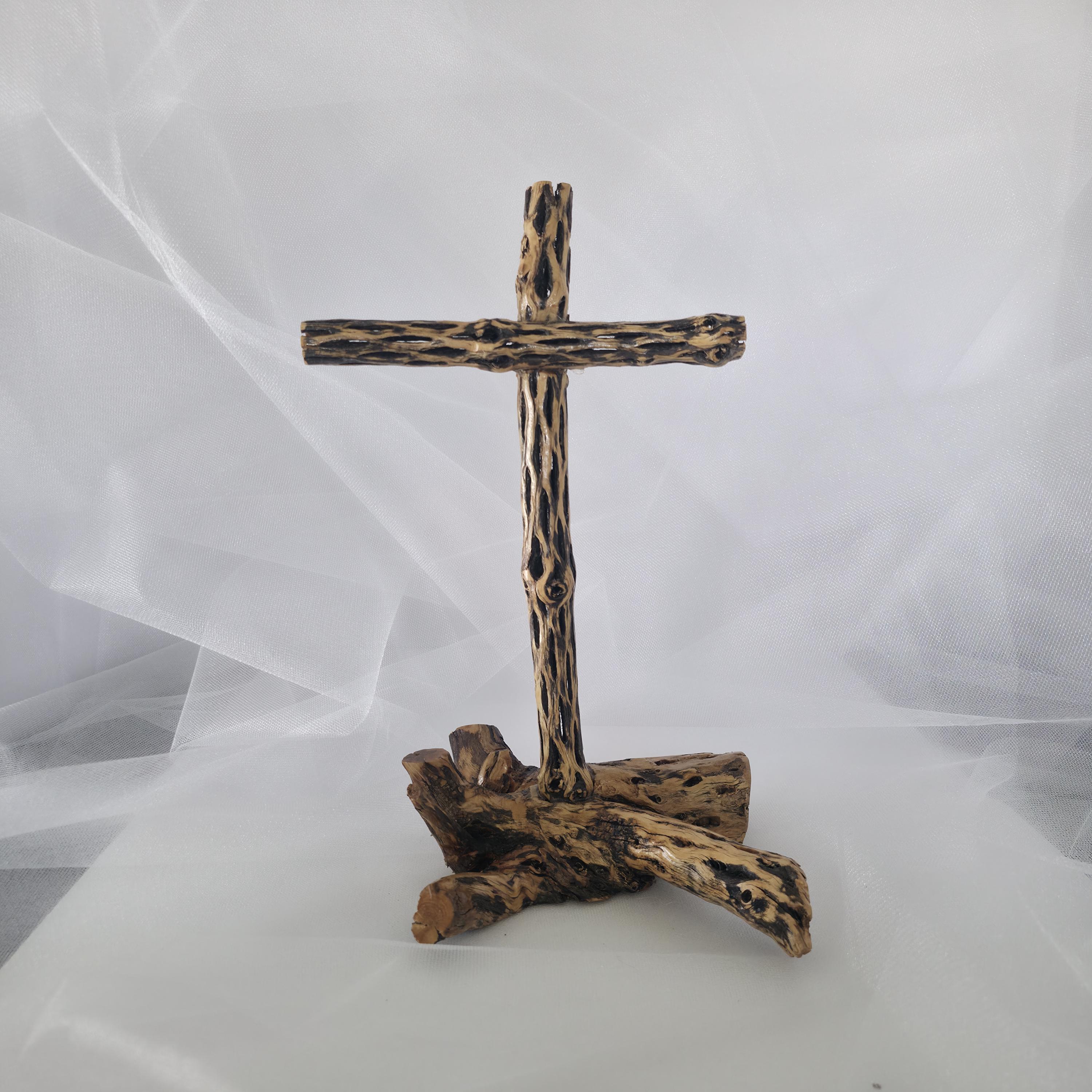 Embrace the rugged beauty of the desert with this one-of-a-kind handmade Cholla Cactus Wood Cross. Each piece is carefully crafted using authentic dried cholla skeleton, known for its iconic organic "lattice" or "honeycomb" patterns. This cross is securely mounted on a sturdy, natural wood base, creating a striking silhouette that balances rustic charm with spiritual significance. Because cholla is a natural material shaped by the elements, no two crosses are exactly alike. You are receiving a unique work of art that brings the spirit of the American Southwest into your home. Product Features: • Materials: Authentic Cholla Cactus Wood, Natural Driftwood/Root Base. • Style: Rustic, Southwestern, Boho, Farmhouse. • Dimensions:5x5x11 • Usage: Perfect for a mantle, bedside table, or as a meaningful housewarming or baptism gift. • Handmade Quality: Sanded and finished to highlight the natural wood grain and textures. Note: As this is made from natural desert wood, slight variations in color, texture, and shape are to be expected and celebrated!
