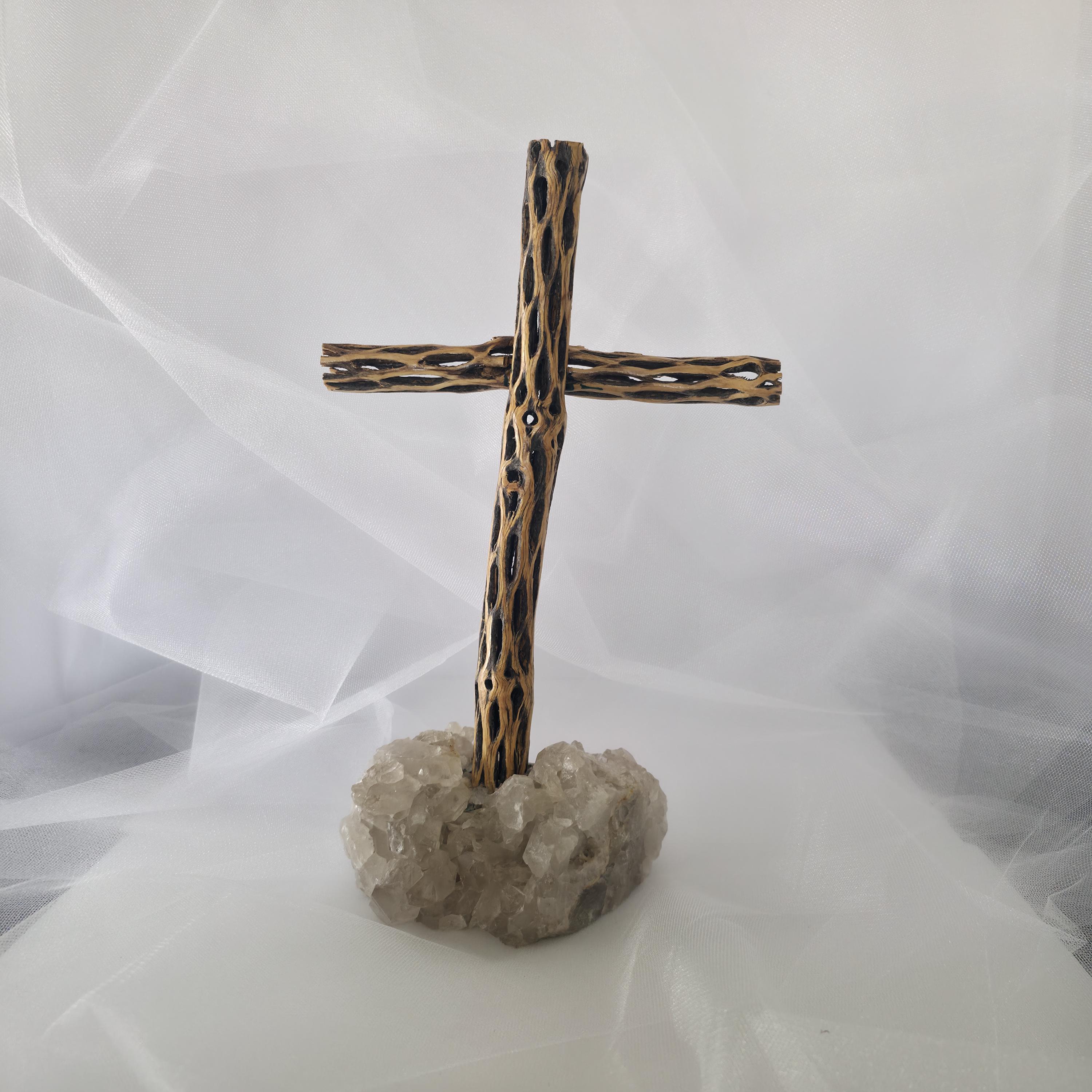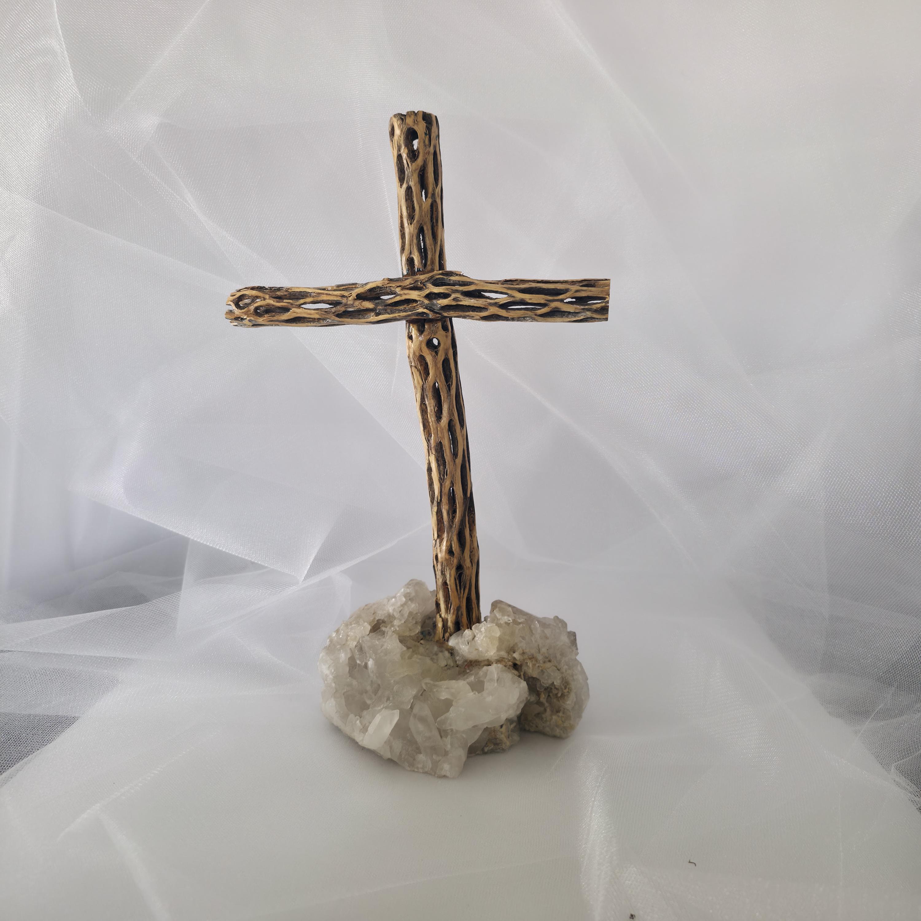 Embrace the rugged beauty of the desert with this one-of-a-kind handmade Cholla Cactus Wood Cross. Each piece is carefully crafted using authentic dried cholla skeleton, known for its iconic organic "lattice" or "honeycomb" patterns. This cross is securely mounted on a sturdy, natural wood base, creating a striking silhouette that balances rustic charm with spiritual significance. Because cholla is a natural material shaped by the elements, no two crosses are exactly alike. You are receiving a unique work of art that brings the spirit of the American Southwest into your home. Product Features: • Materials: Authentic Cholla Cactus Wood, Natural Crystalt Base. • Style: Rustic, Southwestern, Boho, Farmhouse. • Dimensions: 6x5x12 • Usage: Perfect for a mantle, bedside table, or as a meaningful housewarming or baptism gift. • Handmade Quality: Sanded and finished to highlight the natural wood grain and textures. Note: As this is made from natural desert wood, slight variations in color, texture, and shape are to be expected and celebrated!