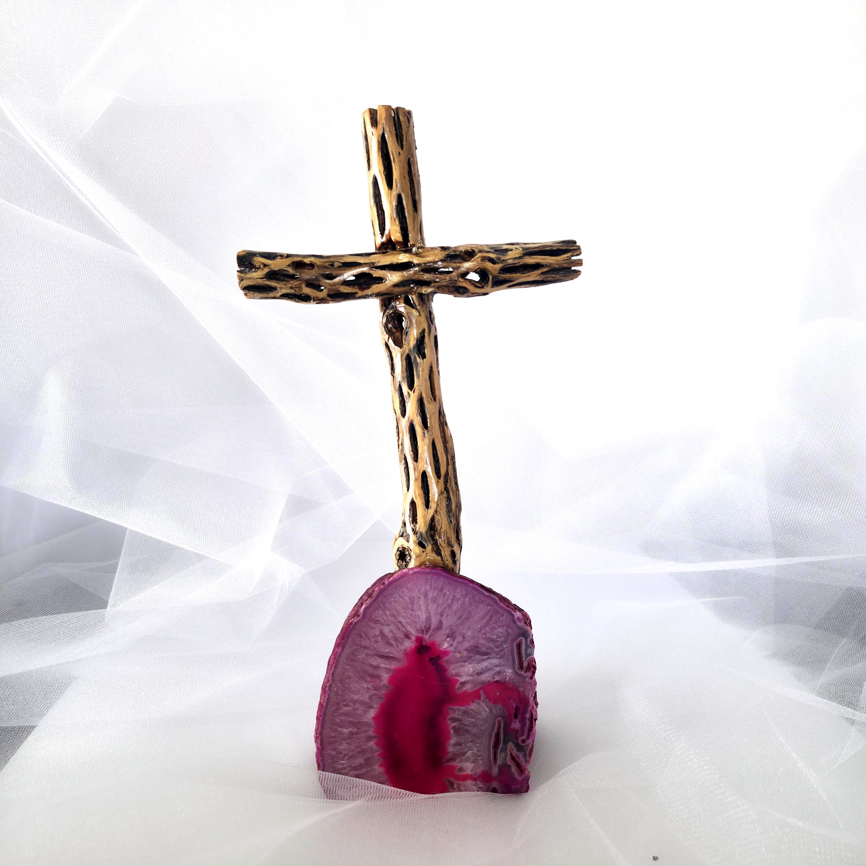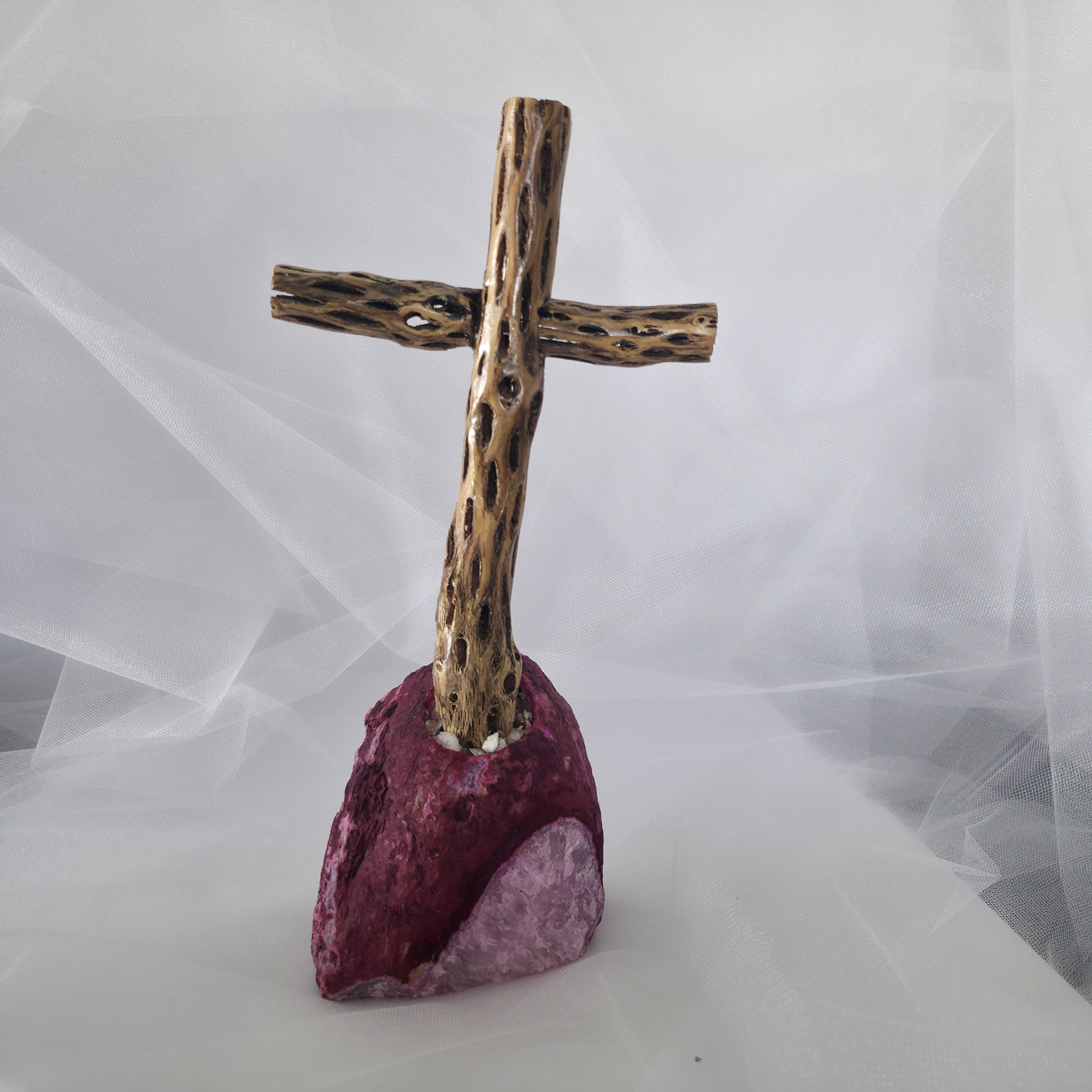 Embrace the rugged beauty of the desert with this one-of-a-kind handmade Cholla Cactus Wood Cross. Each piece is carefully crafted using authentic dried cholla skeleton, known for its iconic organic "lattice" or "honeycomb" patterns. This cross is securely mounted on a sturdy, natural wood base, creating a striking silhouette that balances rustic charm with spiritual significance. Because cholla is a natural material shaped by the elements, no two crosses are exactly alike. You are receiving a unique work of art that brings the spirit of the American Southwest into your home. Product Features: • Materials: Authentic Cholla Cactus Wood, Natural Crystalt Base. • Style: Rustic, Southwestern, Boho, Farmhouse. • Dimensions: 4x3x11/1/2• Usage: Perfect for a mantle, bedside table, or as a meaningful housewarming or baptism gift. • Handmade Quality: Sanded and finished to highlight the natural wood grain and textures. Note: As this is made from natural desert wood, slight variations in color, texture, and shape are to be expected and celebrated!