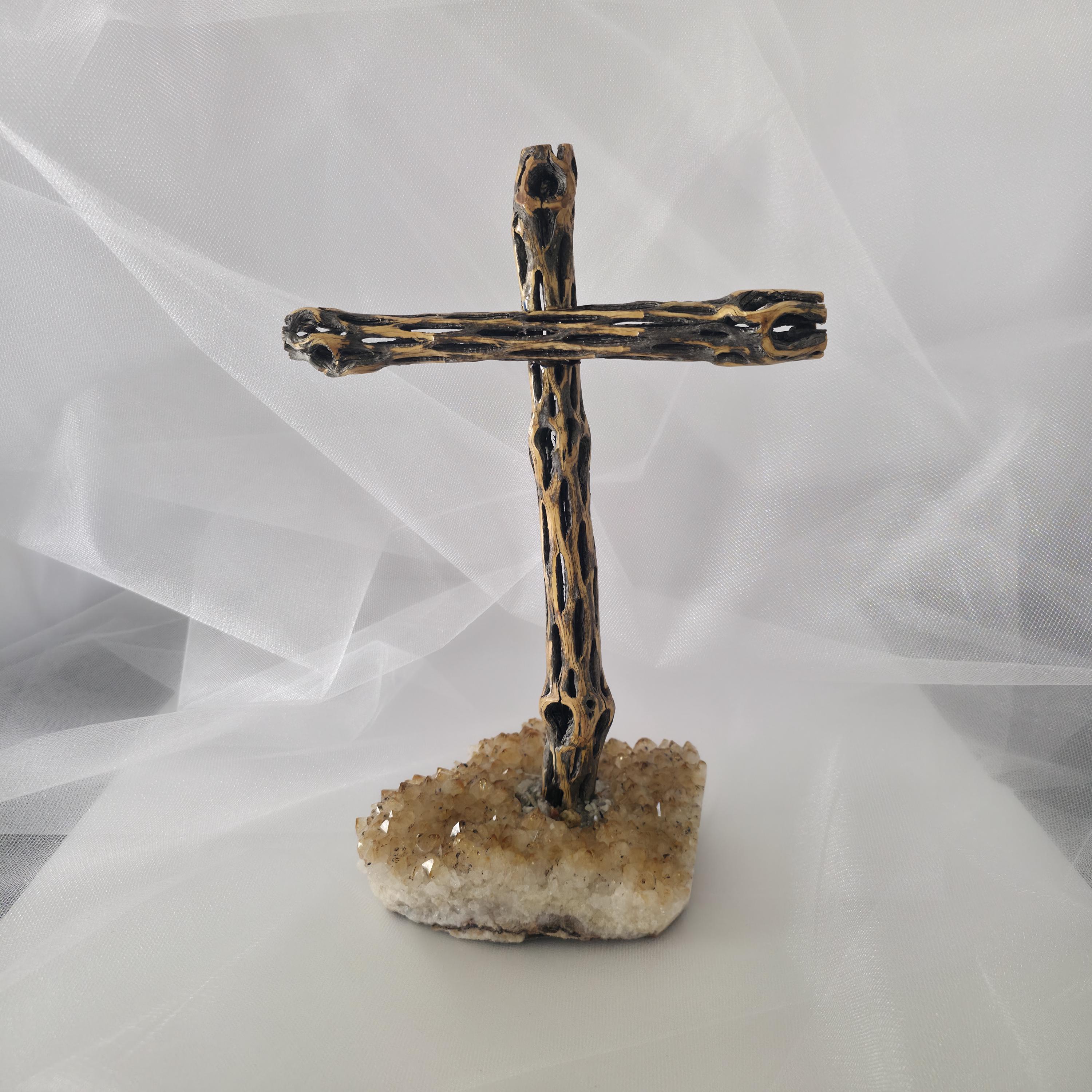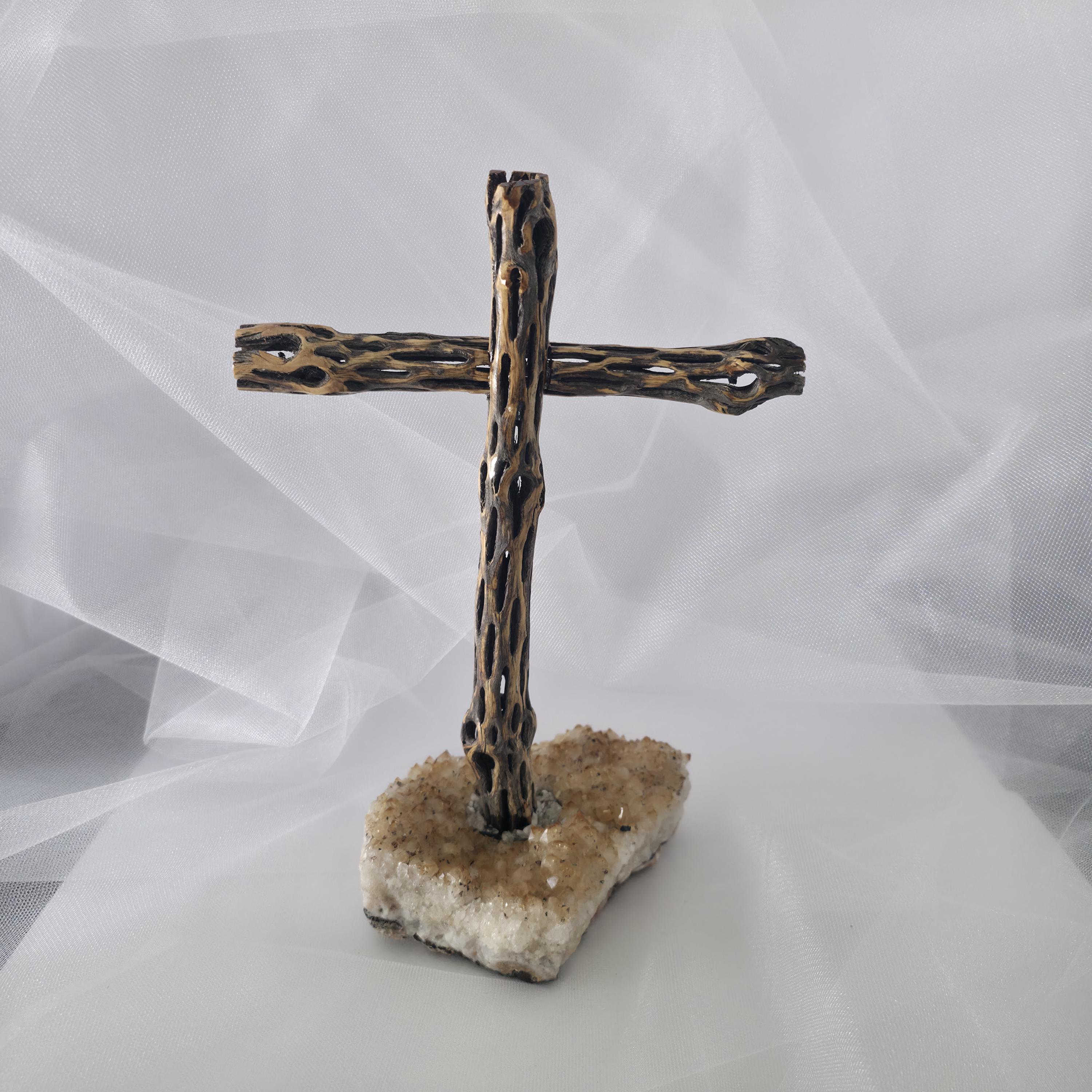 Embrace the rugged beauty of the desert with this one-of-a-kind handmade Cholla Cactus Wood Cross. Each piece is carefully crafted using authentic dried cholla skeleton, known for its iconic organic "lattice" or "honeycomb" patterns. This cross is securely mounted on a sturdy, natural wood base, creating a striking silhouette that balances rustic charm with spiritual significance. Because cholla is a natural material shaped by the elements, no two crosses are exactly alike. You are receiving a unique work of art that brings the spirit of the American Southwest into your home. Product Features: • Materials: Authentic Cholla Cactus Wood, Natural Crystalt Base. • Style: Rustic, Southwestern, Boho, Farmhouse. • Dimensions: 3x5x11/12 • Usage: Perfect for a mantle, bedside table, or as a meaningful housewarming or baptism gift. • Handmade Quality: Sanded and finished to highlight the natural wood grain and textures. Note: As this is made from natural desert wood, slight variations in color, texture, and shape are to be expected and celebrated!
