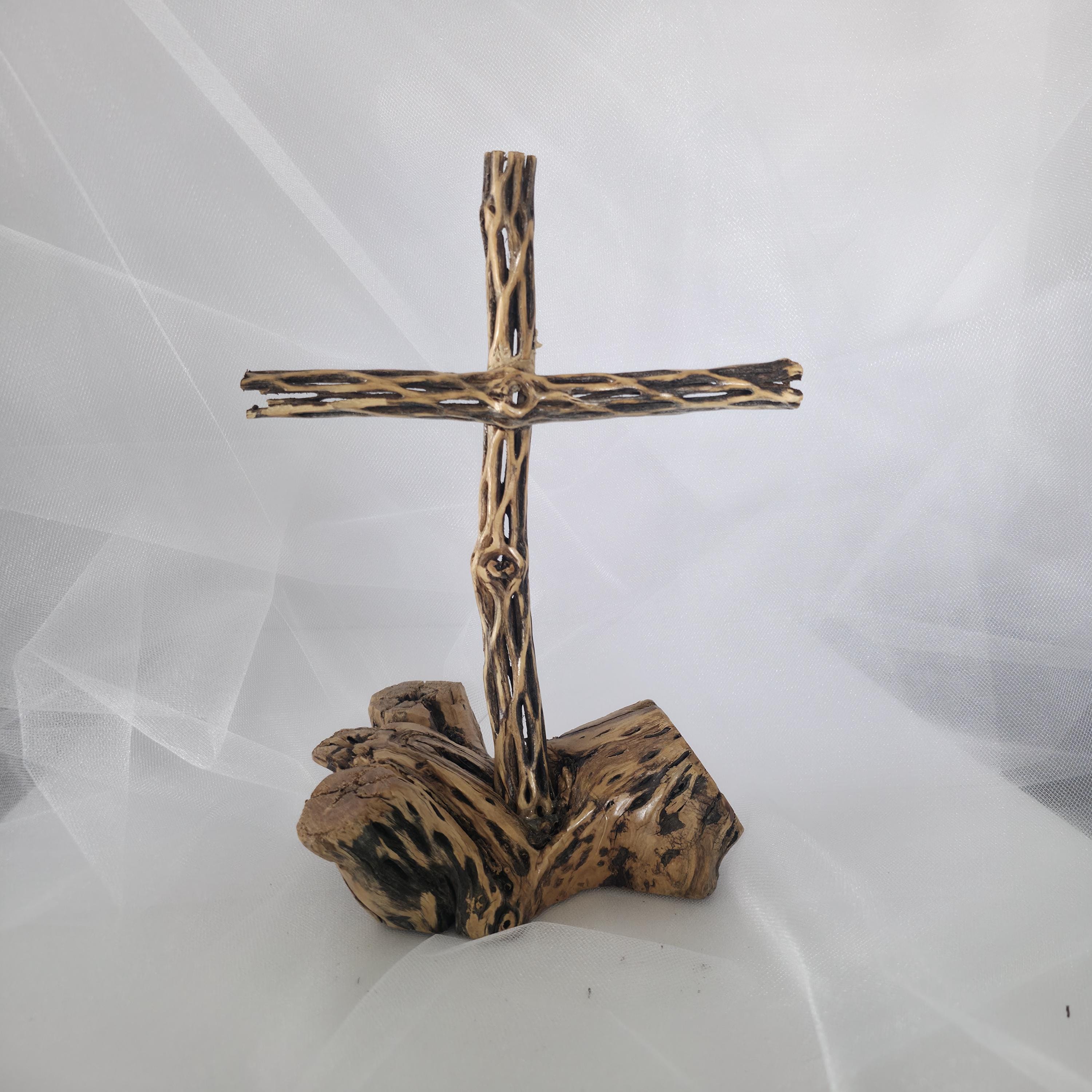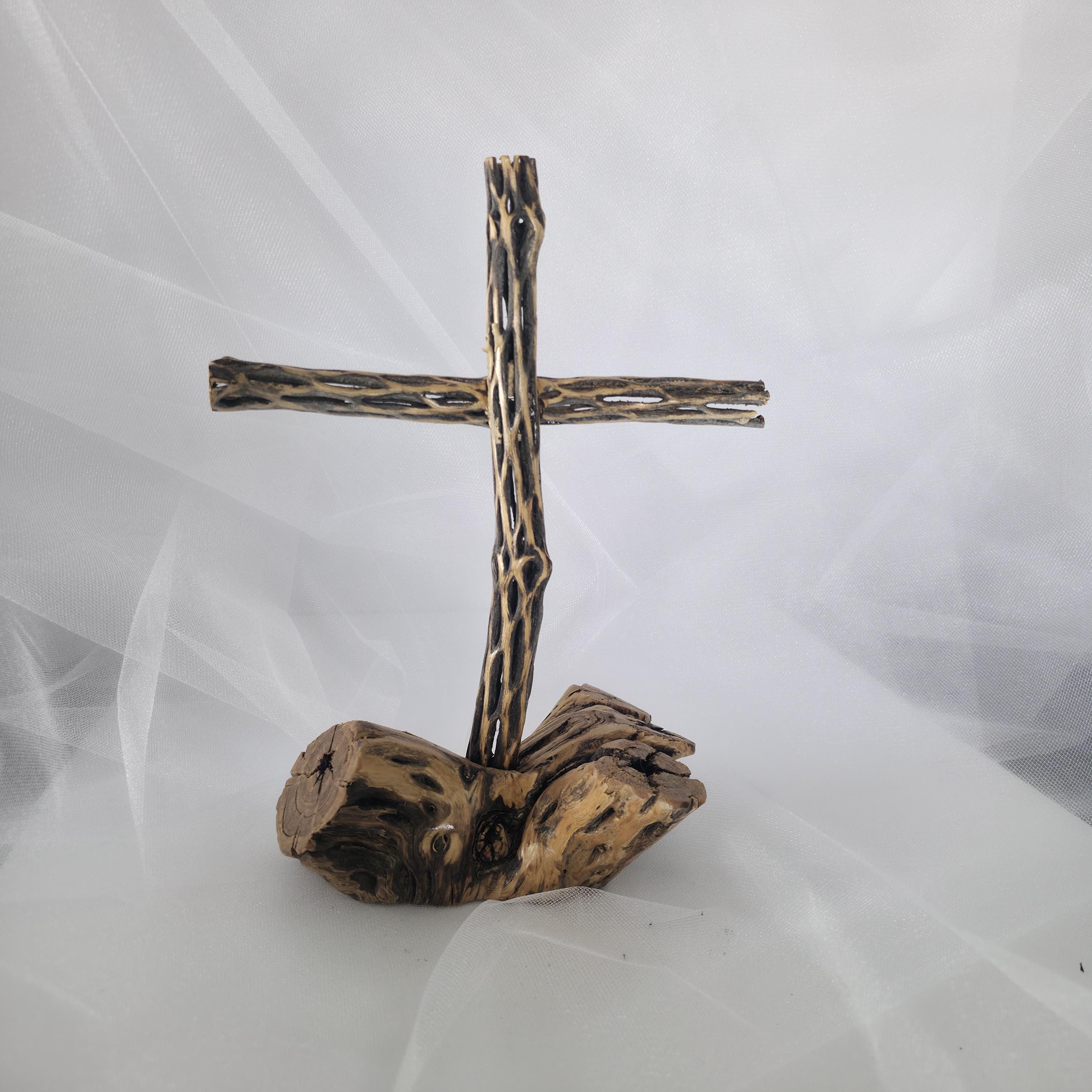 Embrace the rugged beauty of the desert with this one-of-a-kind handmade Cholla Cactus Wood Cross. Each piece is carefully crafted using authentic dried cholla skeleton, known for its iconic organic "lattice" or "honeycomb" patterns. This cross is securely mounted on a sturdy, natural wood base, creating a striking silhouette that balances rustic charm with spiritual significance. Because cholla is a natural material shaped by the elements, no two crosses are exactly alike. You are receiving a unique work of art that brings the spirit of the American Southwest into your home. Product Features: • Materials: Authentic Cholla Cactus Wood, Natural Driftwood/Root Base. • Style: Rustic, Southwestern, Boho, Farmhouse. • Dimensions: 6x5x10 • Usage: Perfect for a mantle, bedside table, or as a meaningful housewarming or baptism gift. • Handmade Quality: Sanded and finished to highlight the natural wood grain and textures. Note: As this is made from natural desert wood, slight variations in color, texture, and shape are to be expected and celebrated!