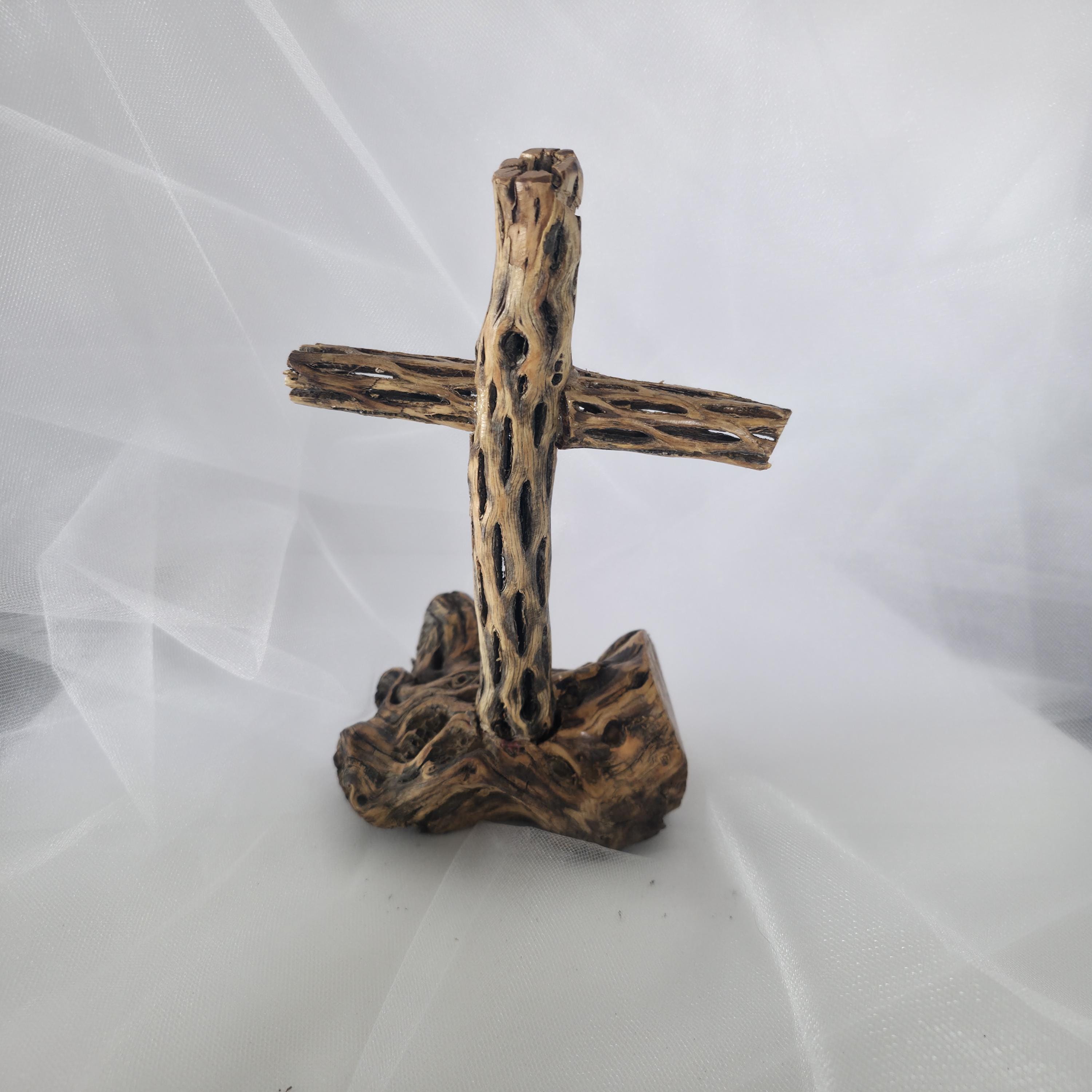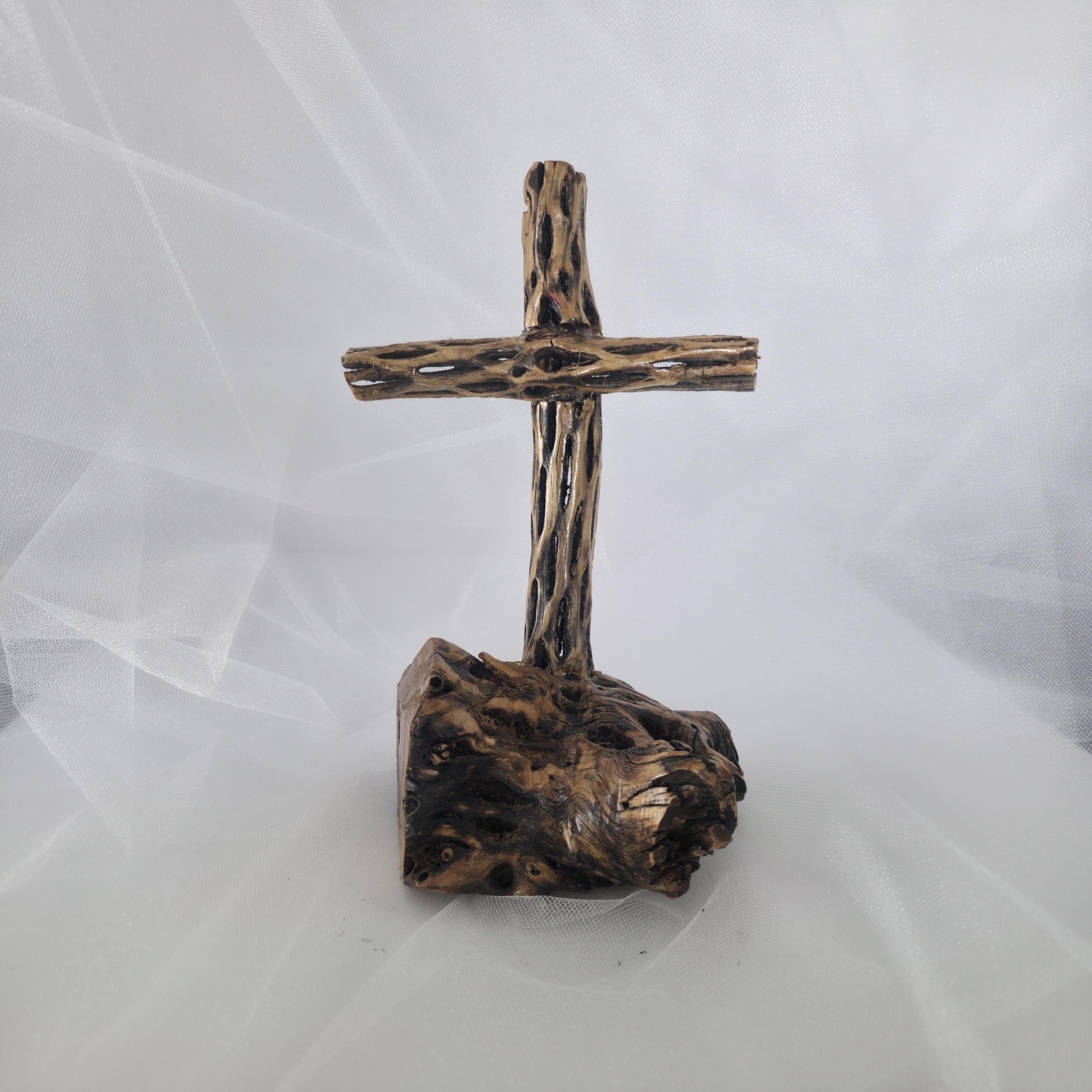 Embrace the rugged beauty of the desert with this one-of-a-kind handmade Cholla Cactus Wood Cross. Each piece is carefully crafted using authentic dried cholla skeleton, known for its iconic organic "lattice" or "honeycomb" patterns. This cross is securely mounted on a sturdy, natural wood base, creating a striking silhouette that balances rustic charm with spiritual significance. Because cholla is a natural material shaped by the elements, no two crosses are exactly alike. You are receiving a unique work of art that brings the spirit of the American Southwest into your home. Product Features: • Materials: Authentic Cholla Cactus Wood, Natural Driftwood/Root Base. • Style: Rustic, Southwestern, Boho, Farmhouse. • Dimensions: 5x5x8 • Usage: Perfect for a mantle, bedside table, or as a meaningful housewarming or baptism gift. • Handmade Quality: Sanded and finished to highlight the natural wood grain and textures. Note: As this is made from natural desert wood, slight variations in color, texture, and shape are to be expected and celebrated!