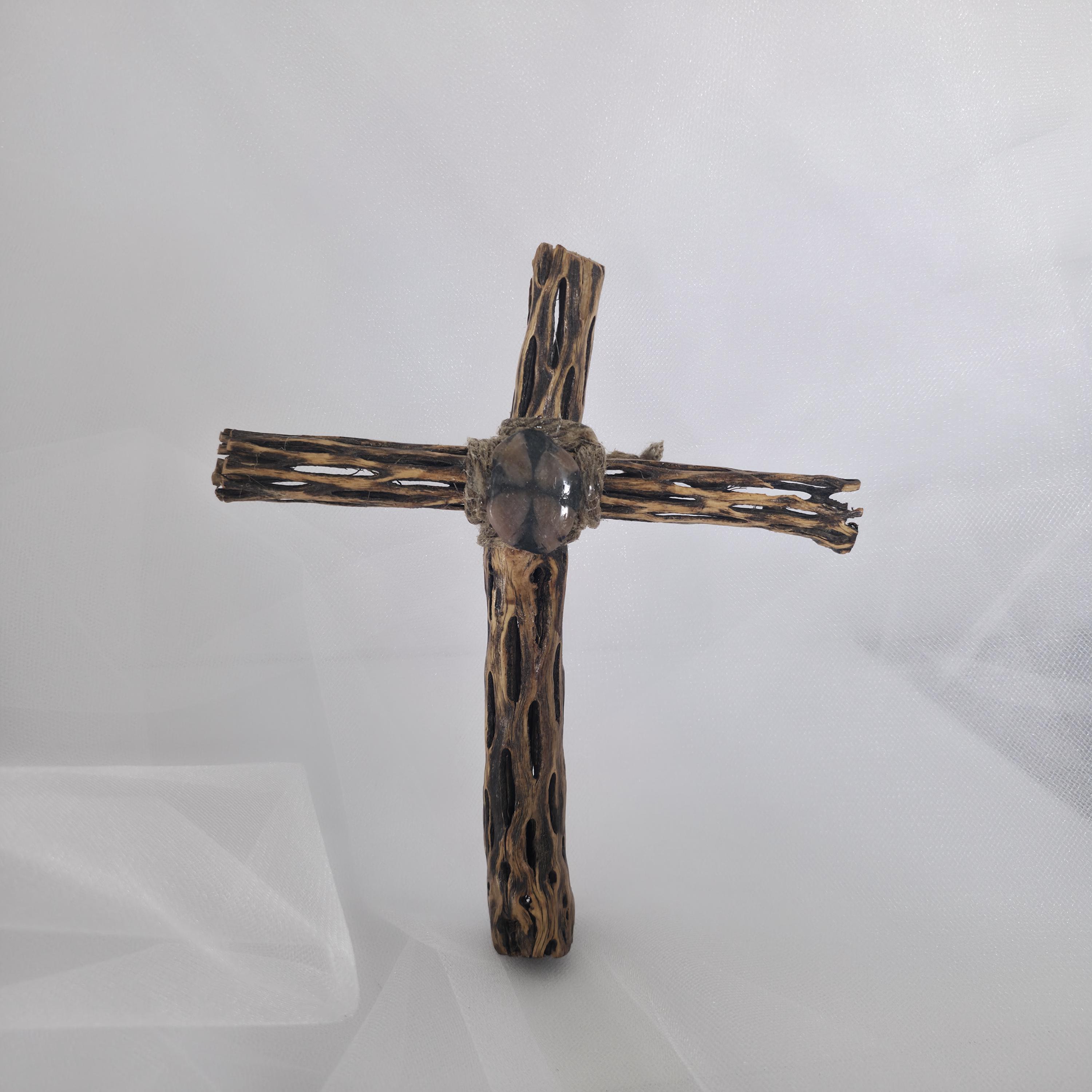 Embrace the rugged beauty of the desert with this one-of-a-kind handmade Cholla Cactus Wood Cross. Each piece is carefully crafted using authentic dried cholla skeleton, known for its iconic organic "lattice" or "honeycomb" patterns. This cross hangs on a wall, natural wood base, creating a striking silhouette that balances rustic charm with spiritual significance. Because cholla is a natural material shaped by the elements, no two crosses are exactly alike. You are receiving a unique work of art that brings the spirit of the American Southwest into your home. Product Features: • Materials: Authentic Cholla Cactus Wood, Natural Driftwood/Root Base. • Style: Rustic, Southwestern, Boho, Farmhouse. • Dimensions:6x7 • Usage: Perfect for a mantle, bedside table, or as a meaningful housewarming or baptism gift. • Handmade Quality: Sanded and finished to highlight the natural wood grain and textures. Note: As this is made from natural desert wood, slight variations in color, texture, and shape are to be expected and celebrated!